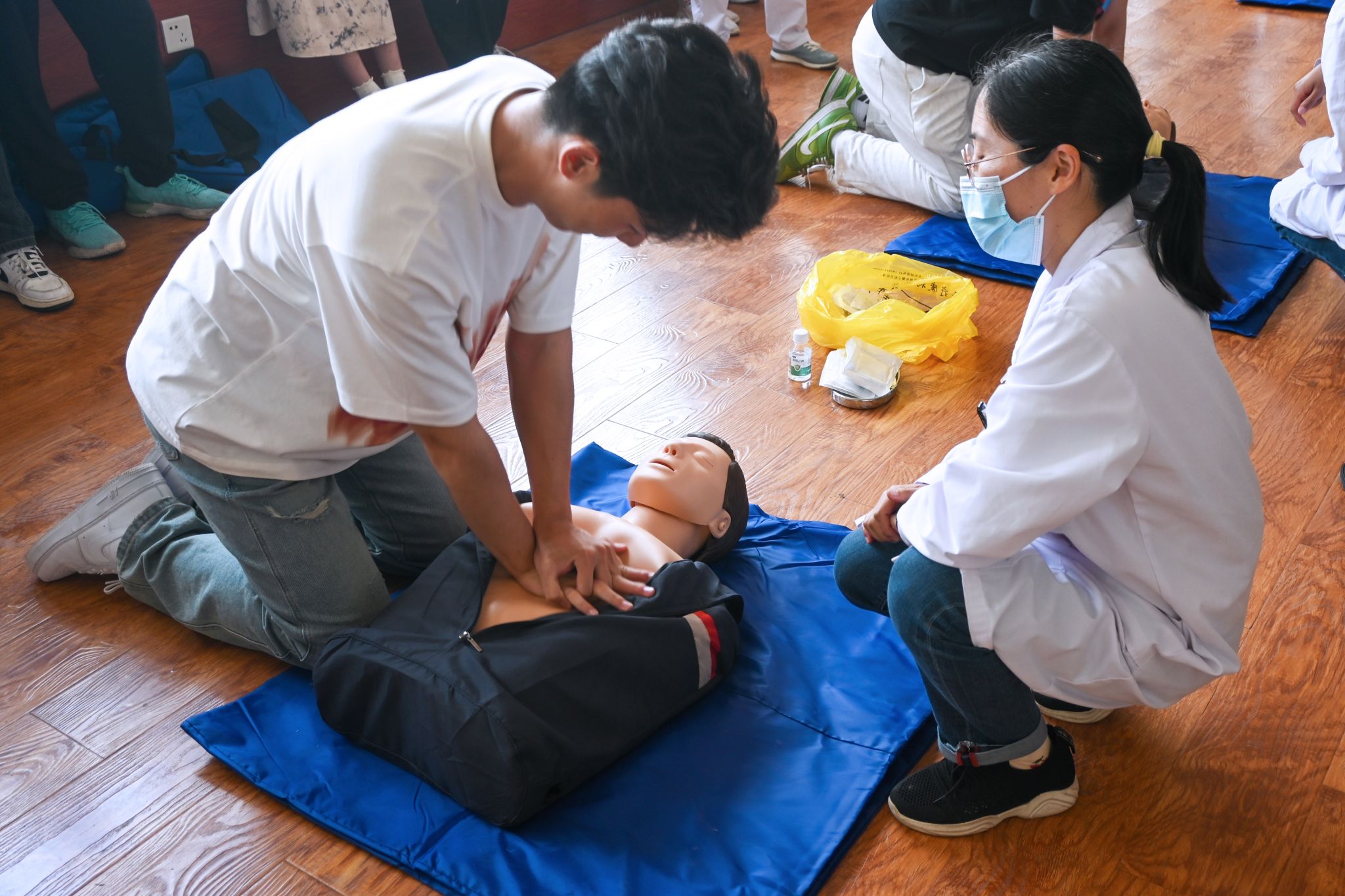 应急救护讲座中,校医院陈辉首先强调了应急救护在生活中的重要性,介绍了部分突发疾病类型和危害,着重从心肺复苏、中暑、低血糖、运动损伤、外伤出血、烫伤、猫狗咬伤等方面对应急救助措施进行了详细讲解,用真实的案例提醒同学们要掌握基础急救知识,具备自救互救能力。随后,陈辉与团队专业人员现场演示了心肺复苏(CPR)的操作流程,并分组指导观摩的学生实际练习。