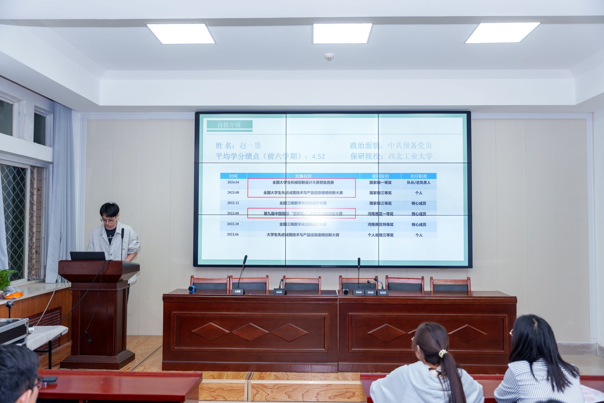 在分享环节,推免至西北工业大学的赵一墨同学从自身经历出发,讲述了专业知识应用到机械创新设计大赛、先进成图大赛等学科竞赛的经验感悟,鼓励同学们勇于挑战,积极参赛;推免至华南理工大学的闫子阳同学讲述了参与“挑战杯”、“互联网+”等国家级综合竞赛的感想收获,勉励同学们要发掘自身创新潜能,勇于突破自我;推免至南京航空航天大学的武新龙同学分享了保研经历和学习方法,鼓励同学们要勇于尝试,拓宽视野;推免至中南大学的张新露同学以大学生活经历为切入点,讲述了参与社会实践、志愿服务活动的重要性与意义,呼吁同学们要抢抓机遇,全面发展;推免至南京航空航天大学的王家琪同学,分享了担任学生干部期间的磨砺和成长,并讲解了保研推免条件以及推免过程中的注意事项,鼓励同学们要坚定信念,积极进取,勇攀高峰。