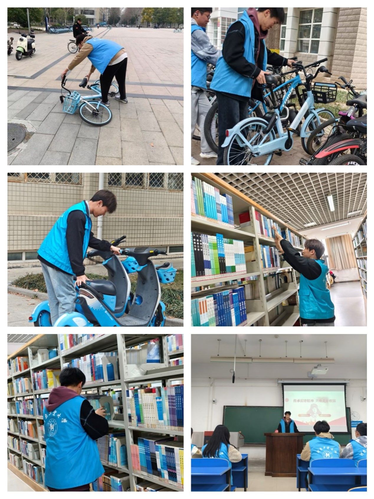 紧接着,志愿者们兵分多路,以实际行动践行雷锋精神。在校园共享单车区域,他们细心地将无序停放的自行车与电动车归位,确保安全通道畅通无阻,有效改善了校园交通秩序。