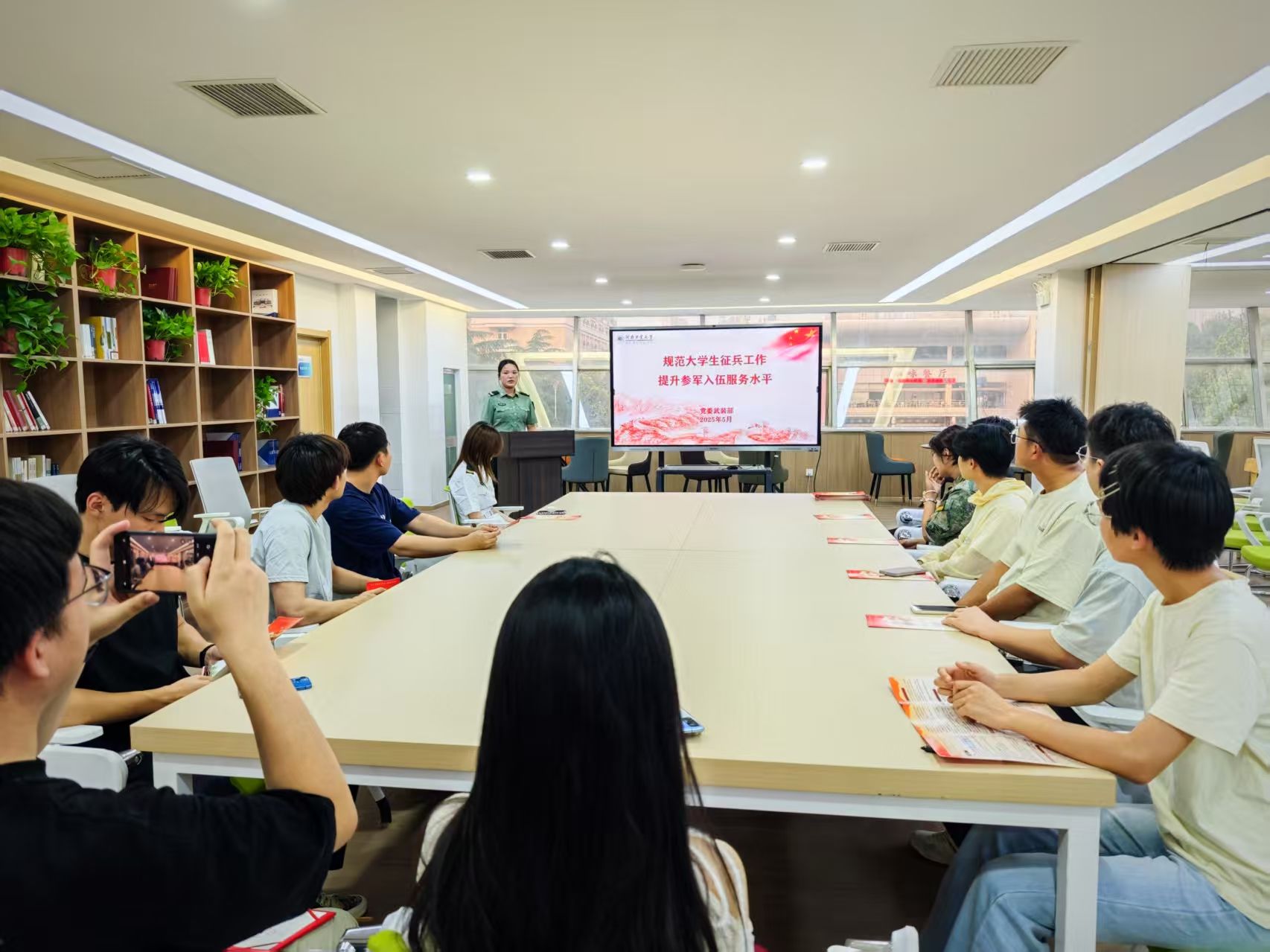 于5月29日在德园一站式学生社区召开大学生征兵入伍宣讲会。此次宣讲会特邀学校武装部征兵宣讲团成员现场宣讲,毕业班辅导员杨贞贞、有意向应征入伍的2025届毕业生同学参加了会议。
