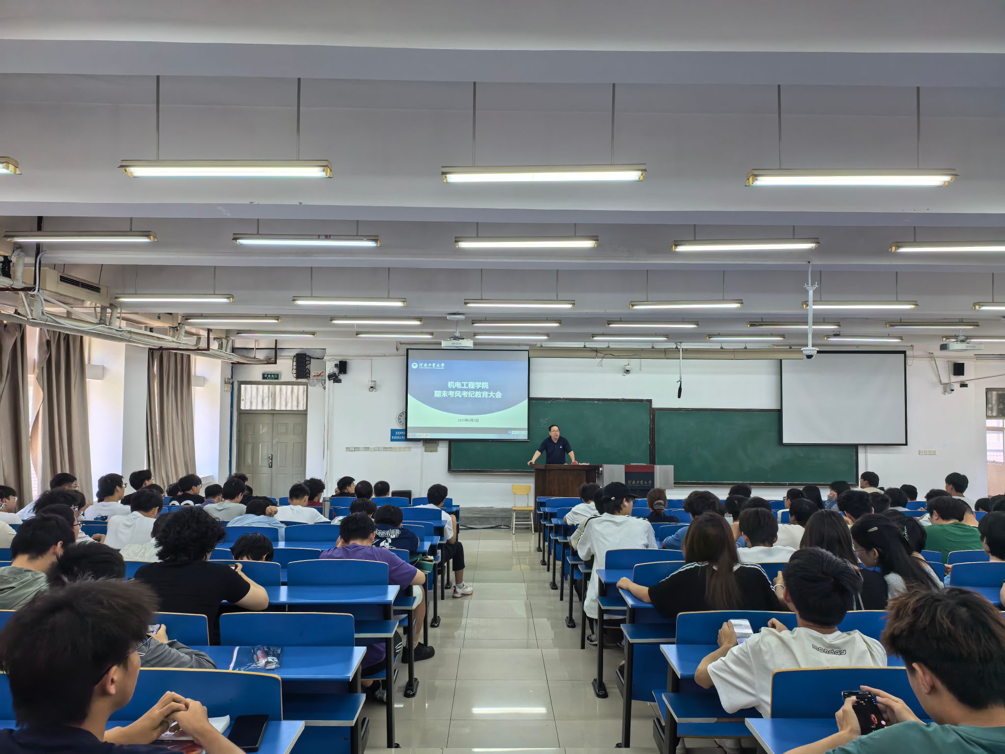 在4号楼322教室、422教室召开学期末考风考纪教育大会。院教学办主任王彦林,辅导员周贝贝、靳晓燕及2024级全体同学参会。