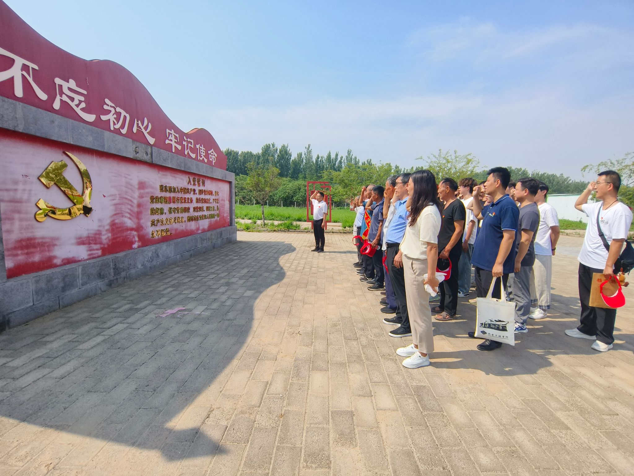 在学校派驻马古岗村第一书记郭少东带领下,全体党员在展览馆广场整齐列队,面向鲜红党旗庄严宣誓。“我志愿加入中国共产党……”铿锵有力的誓言,表达了党员们对党的无限忠诚与为共产主义事奋斗的坚定决心。