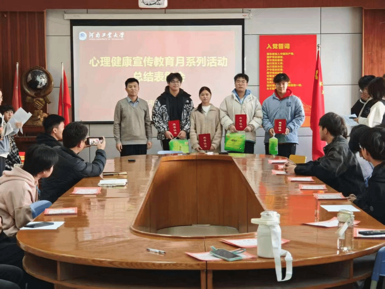 在7415会议室举办大学生心理健康宣传教育月活动总结暨表彰会。辅导员周贝贝、谢亚杰,学生会生活权益部负责人及获奖同学代表参会。