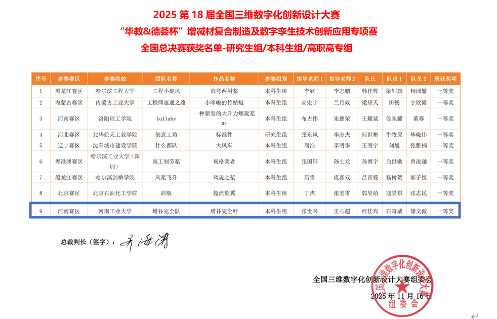 本次大赛以“智创融合,孪生赋能”为主题,涵盖数字化创新设计、CAM/数智制造、增材制造和桌面式五轴加工数字孪生技术、增材制造设备和桌面式五轴加工中心设备现场实操、产品功能实现等五个环节中的实际工程问题。要求参赛选手在120分钟内完成螺旋桨叶的数字化设计、CAM编程、五轴数字孪生仿真、现场增减材制造与装配测试等全流程任务,对选手的工程实践能力与数字化素养提出了极高挑战。比赛全面考核学生对基础学科及交叉学科理论知识的理解与项目案例的实践创新应用,掌握数智化技术的实际应用及解决实际工程问题的综合实践能力,培养大学生系统性思维,鼓励学科知识交叉融合,鼓励创新、创造精神与数智工匠精神。该赛项旨在培养大学生创新创造精神与实践能力,提升大学生的创新设计、系统设计、实践动手等能力,携手打造具备数智素养,有创意想法、有创新能力、有创造精神、有创业思维的新质人才。促进创新链、产业链、教育链、人才链的深度融合,以教育、科技、人才的良性循环赋能新质生产力高质量发展。