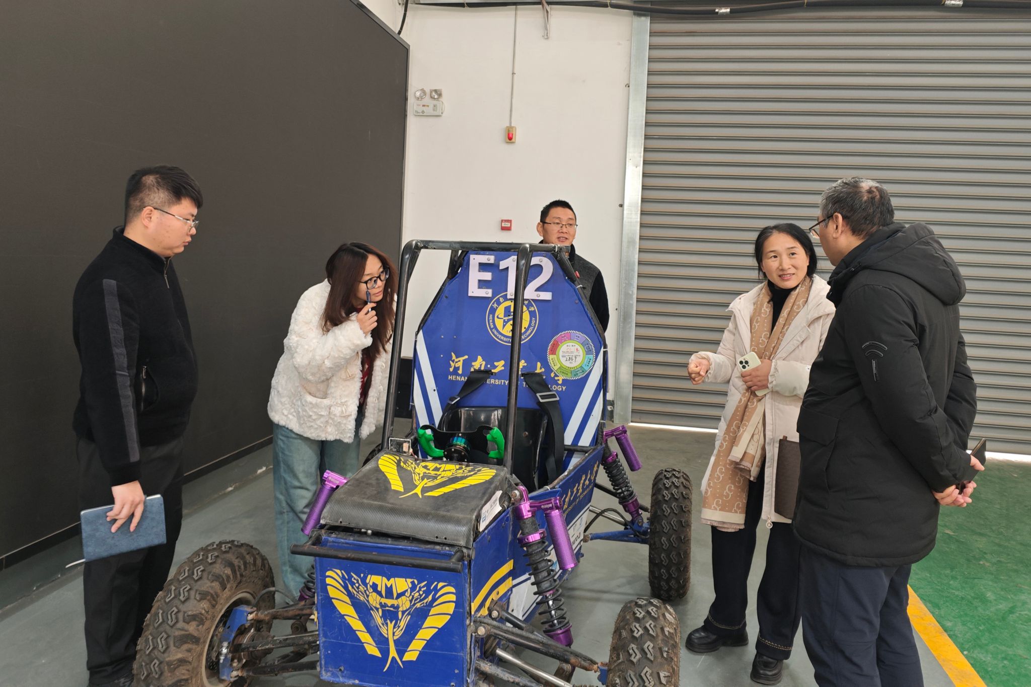 座谈结束后,侯瑞娟一行走访了车辆工程系实验室,重点考察了“阿波粮”智能粮食物流平台车、巴哈赛车、智能粮食清扫车等产教融合标志性成果;亲身体验了由司俊德老师研发的公交车驾驶模拟器,对该模拟器在驾驶技能培训、应急处置演练中的实用价值给予高度评价。