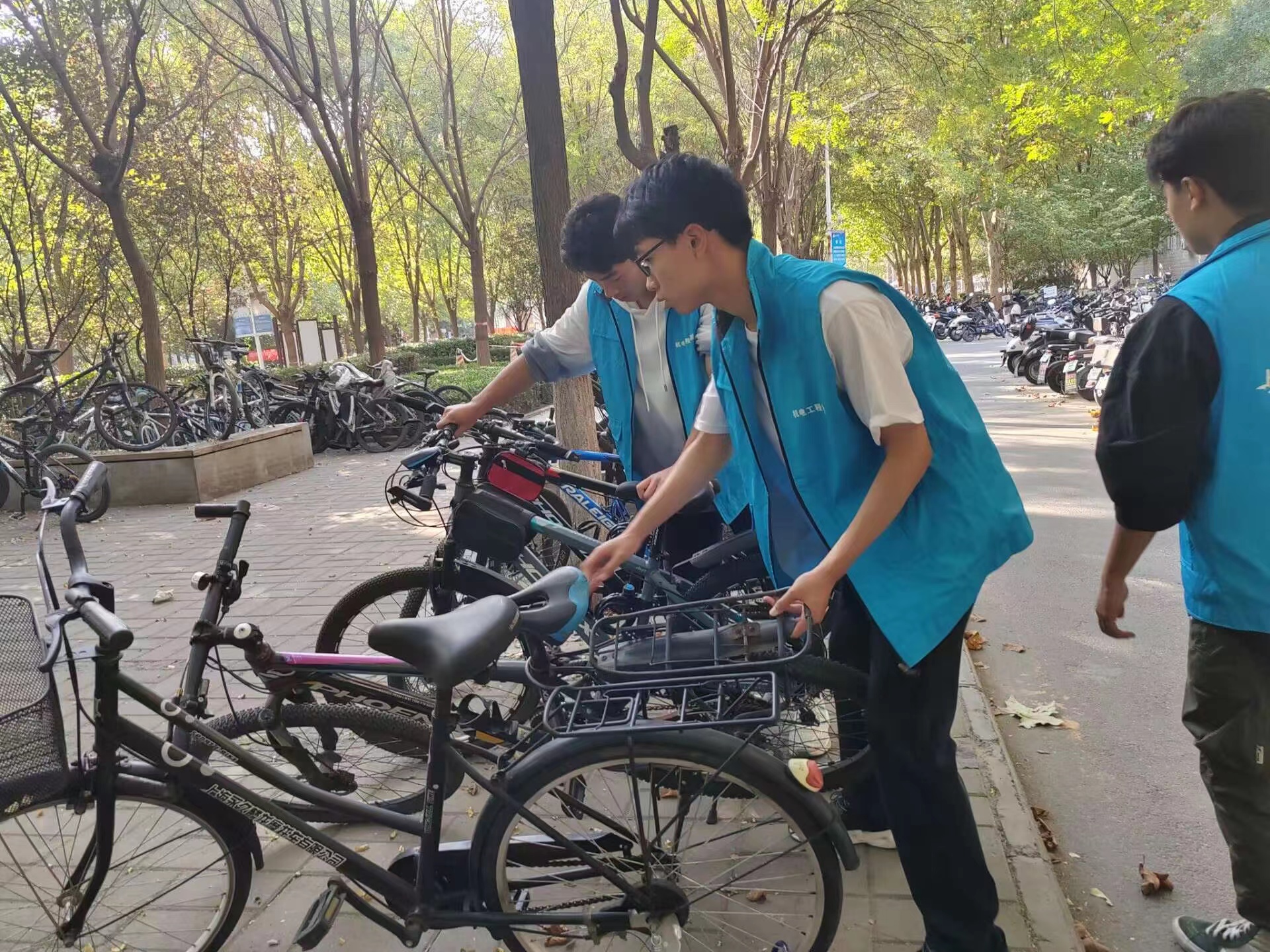 同学们来到各公寓区共享单车停放点,对乱停乱放的单车进行统一规范地摆放与整理。志愿者们以饱满的热情忙碌在单车摆放的志愿服务工作中,并对驻足停放单车的同学讲解了单车文明摆放的正确方式。