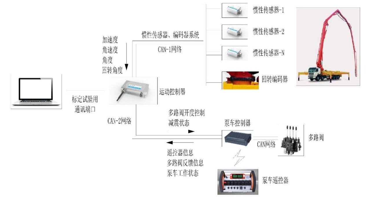 减振控制系统可在所有姿态下,使臂架回转运动过程更平稳减少爬行、遥控器操作停止后臂架往复摆动幅度和时间大大减小,在臂架变幅运动、回转运动、泵送同时开启工况下,臂架上下晃动不超过±0.25米,左右晃动幅度不超过±0.2米。