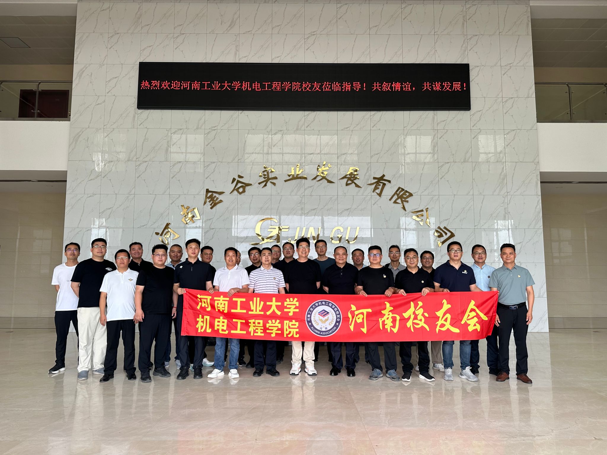 河南校友会 25 位校友参访河南金谷实业发展有限公司,这是校友会成立后的第二次校友企业走访活动。河南金谷实业董事长常兰州(粮油食品学院78级校友)、常务副总常东涛(06级校友,兼机电学院河南校友会副会长)热情接待。