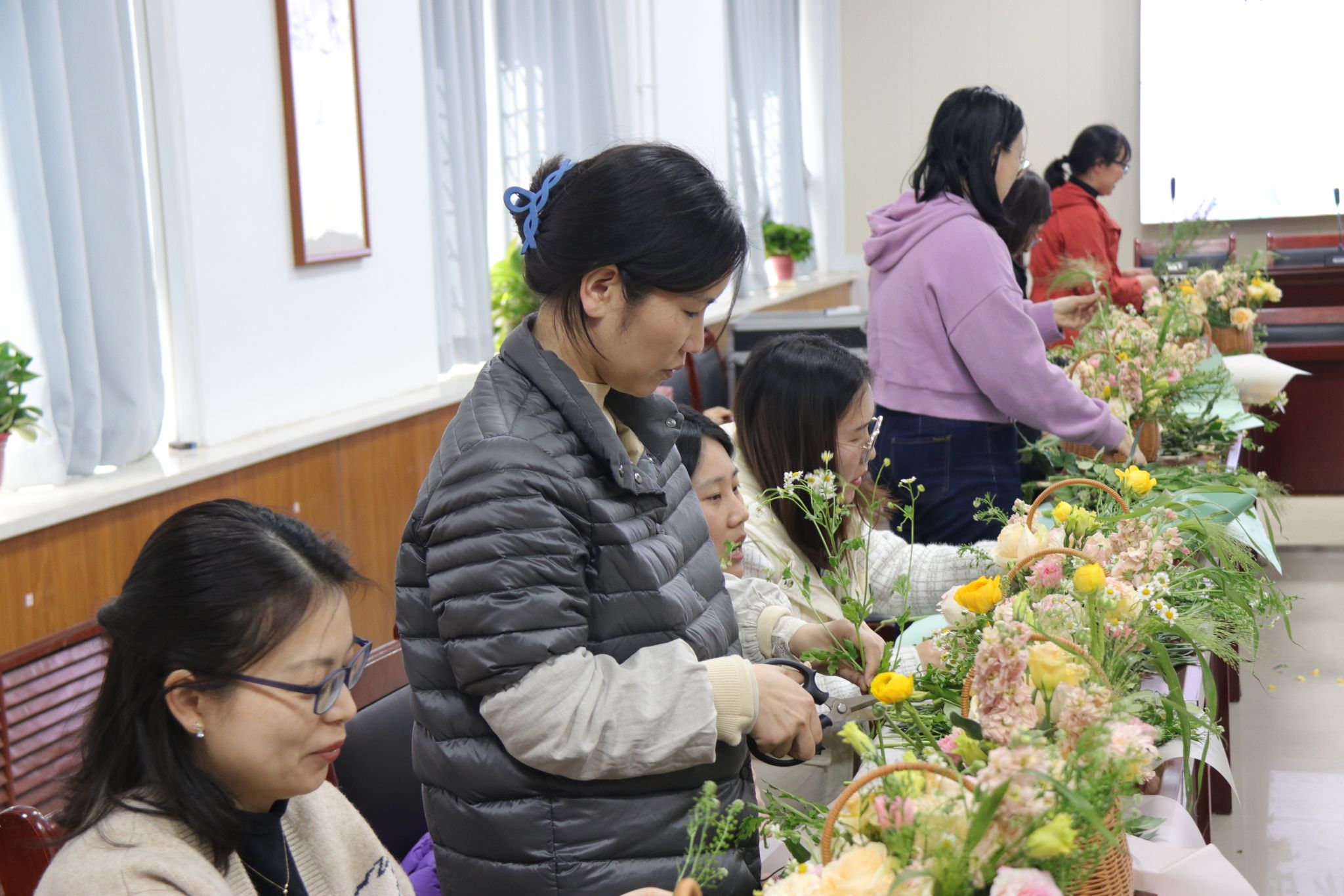 插花活动现场,花艺师首先向大家介绍了鲜花的名称、代表的意义和鲜花的花语。花艺师在讲解授课的过程中不时穿插互动环节,整个活动室充满了轻松愉悦的氛围。女教职工们在花艺师的悉心指导下,大胆发挥自己的想象力,通过自己灵巧的双手,将经过修剪和整枝的玫瑰、康乃馨、紫罗兰、喷泉草等多种花材,根据不同的色彩、形状有层次地搭配在一起。置身于鲜花丛中的女教职工们兴致盎然。临近尾声,一盆盆融合了丰富想象力的插花作品展现在了大家的面前,每个人心中都充满了喜悦和成就感。