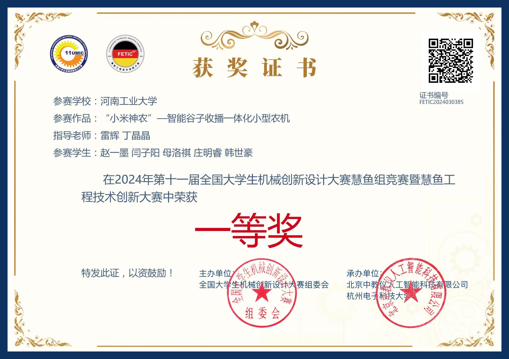 雷辉、郏国中老师指导,赵一墨、王冉等10位同学设计的两项作品:“小米神农-—智能谷子收播一体化小型农机”和“葱葱那年—大葱多功能收获管理一体机”,在与浙江大学、西安交通大学、哈尔滨工业大学、华中科技大学等全国170余所高校740多件作品的角逐中脱颖而出,均斩获全国一等奖的好成绩。