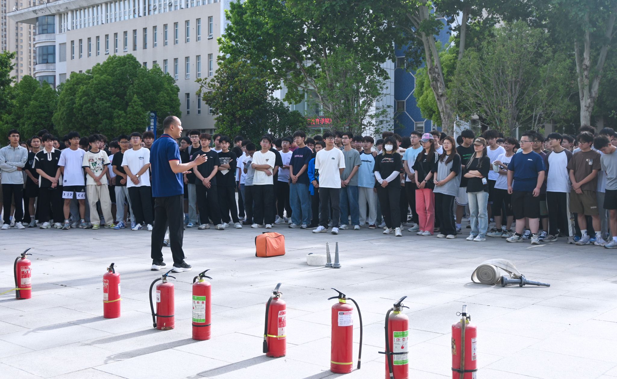 消防演练过程中,保卫处孙志华向同学们作了详细的消防安全知识讲解和火灾逃生注意事项,并对火灾逃生过程中可能遭遇的烟雾危害进行了技能分享。演习过程中,他带领同学们逐项学习了灭火毯、防毒面具、消防栓和灭火器的使用方法,细心指导同学们分组进行灭火操作。