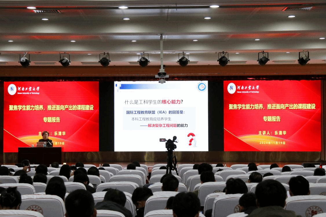 专题报告在学术报告中心D303进行,学校教学指导委员会委员、教学督导、教学院长、教学办人员、基层教学组织负责人、教务部全体人员等400余人参加了本次活动,学校教师教学发展中心主任赵静主持。乐清华教授基于面向产出的教育体系,详细阐述了如何聚焦学生能力培养,制定专业人才培养的产出标准;如何建立面向产出的课程体系,合理下达课程对毕业要求的支撑任务;如何科学设计面向产出的教学大纲,落实课程对学生能力培养的支撑任务;如何依据学生的学习成果开展课程目标达成评价,推进基于评价结果的课程持续改进等四个方面的问题及解决方案。最后,乐清华以典型的案例分析,讲解了如何科学制定面向产出的教学大纲、落实课程支撑毕业要求的任务、评价课程目标的达成情况等。