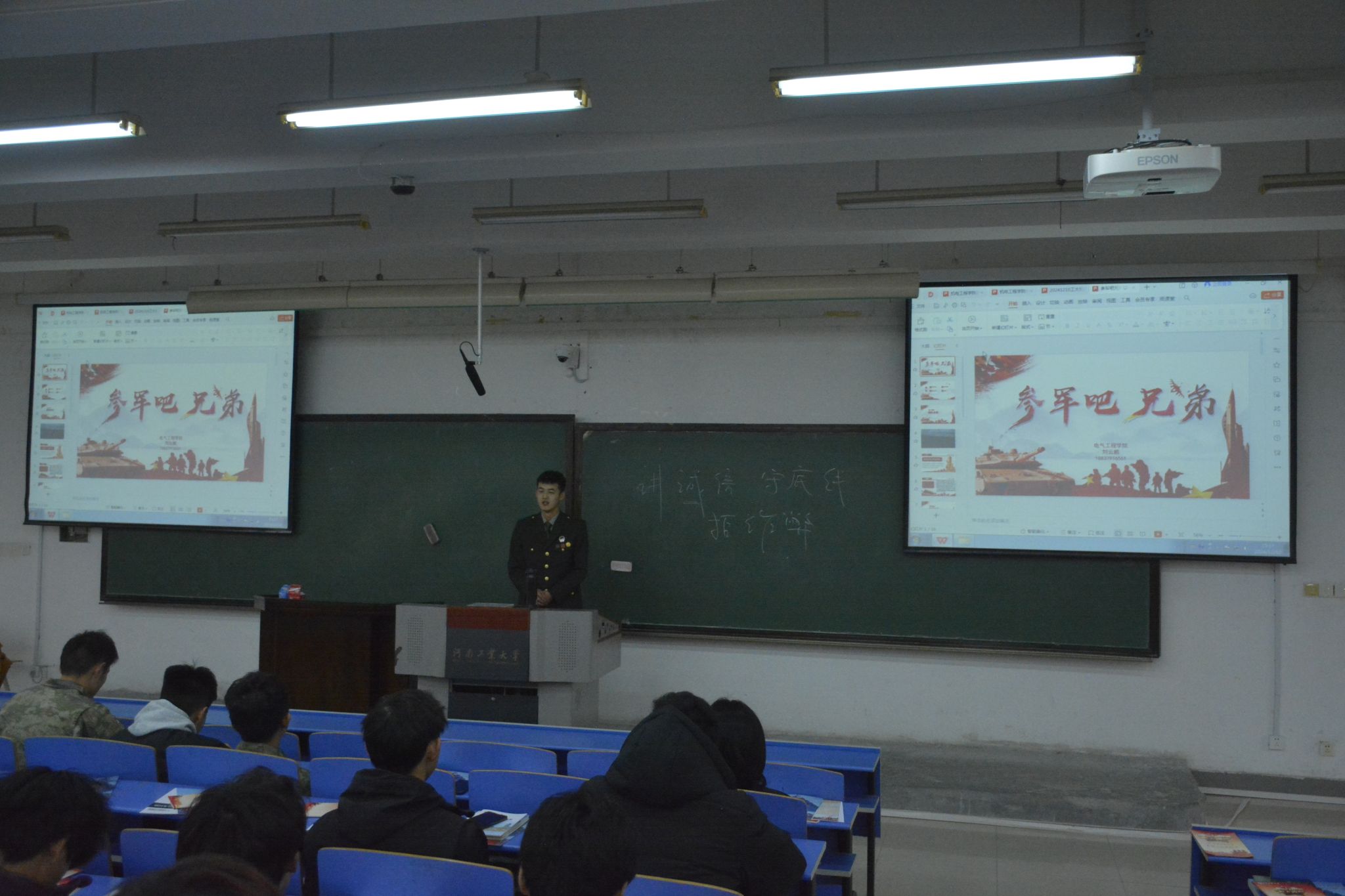在4号楼422教室举办“一站式”学生社区征兵入伍政策宣讲会。学校征兵宣讲团成员、学院辅导员及2024级学生代表200余人参会。会议由辅导员靳晓燕主持。