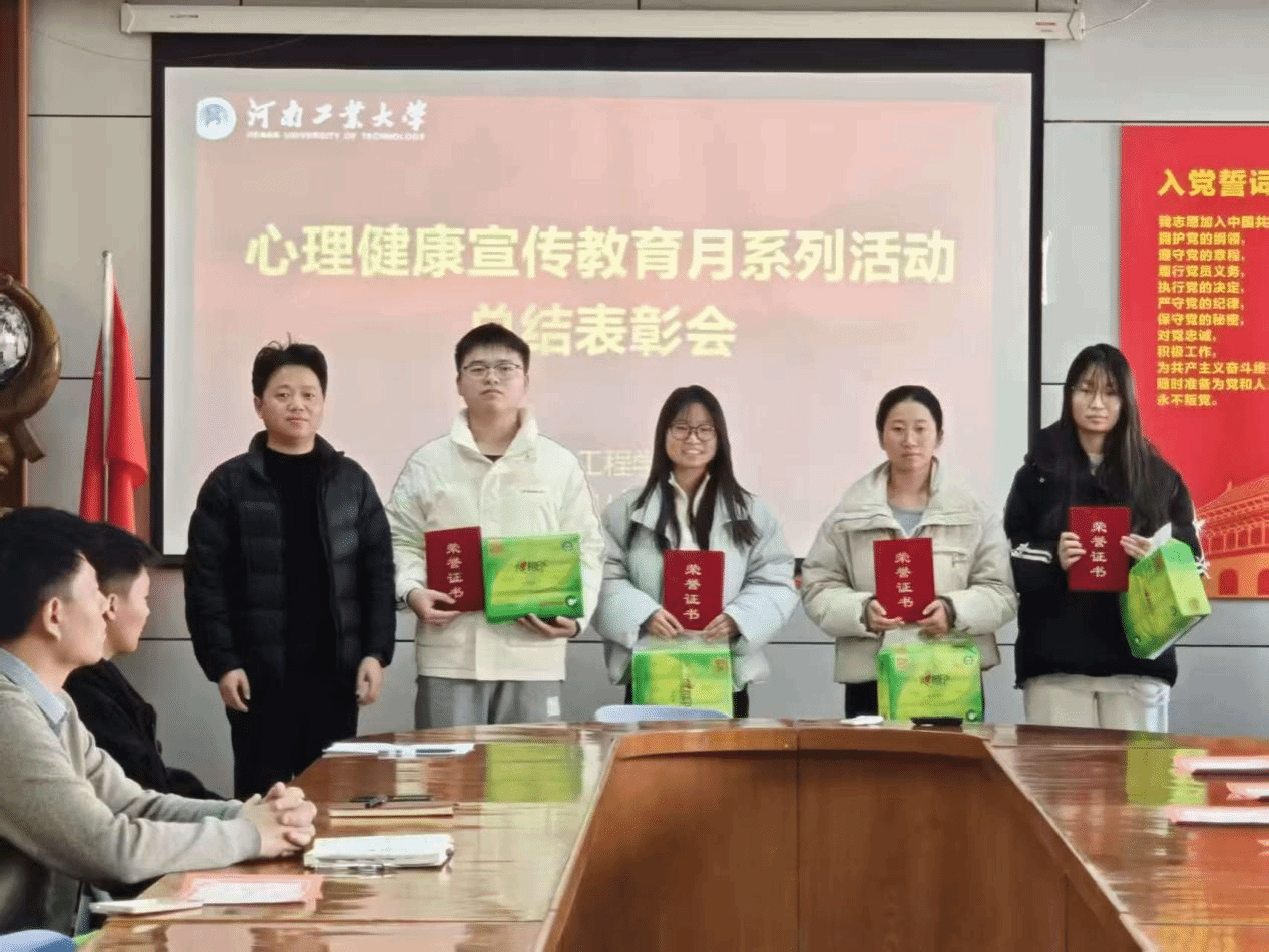 在7415会议室举办大学生心理健康宣传教育月活动总结暨表彰会。辅导员周贝贝、谢亚杰,学生会生活权益部负责人及获奖同学代表参会。