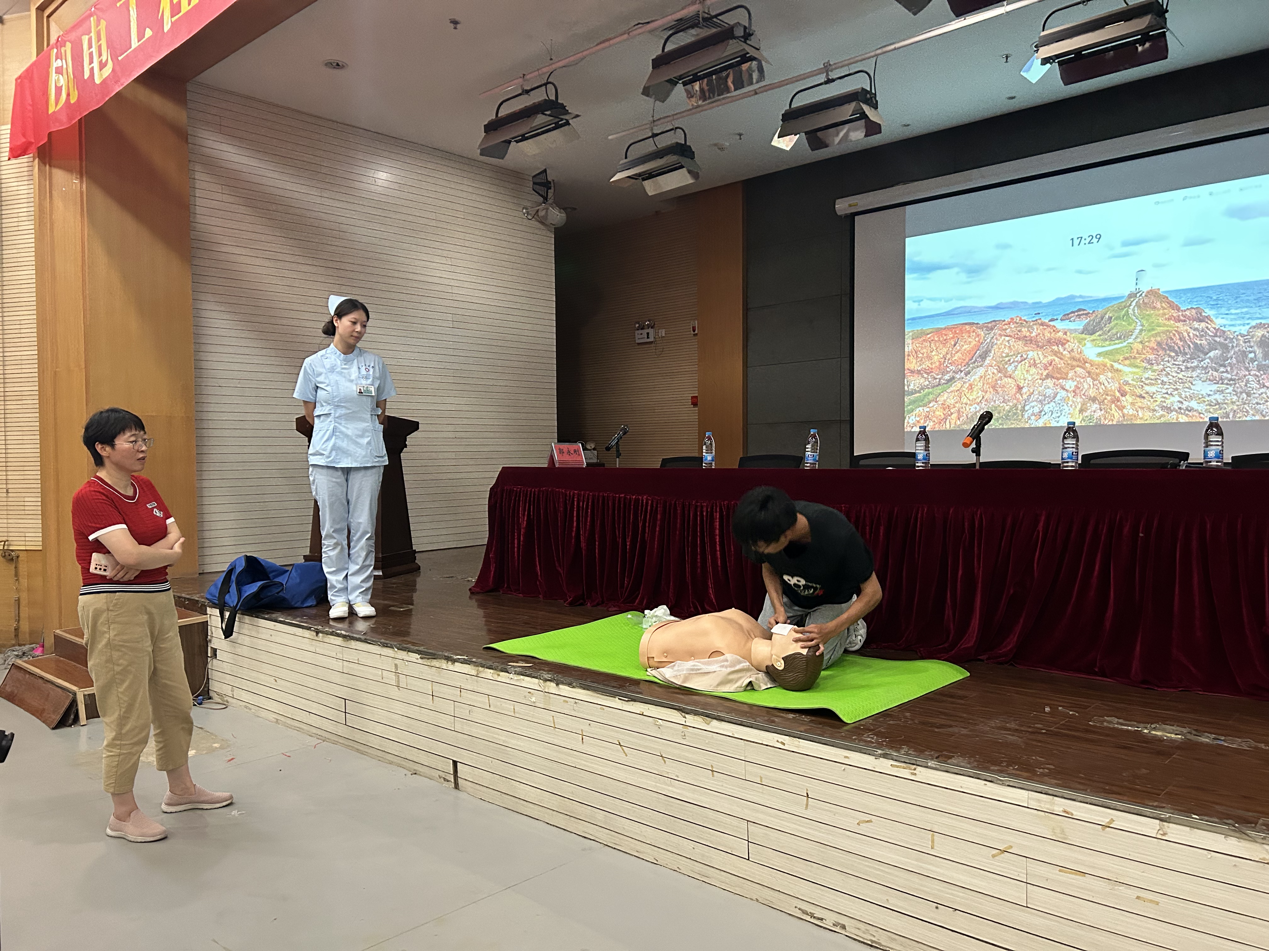 普及急救知识,守护健康工大。学院邀请校医院医务科科长陈辉进行健康知识讲座,普及急救常识。现场医务人员详细讲解了实施心肺复苏的方法,规范示范了打开气道、实施胸外心脏按压和人工呼吸的动作要领,并现场使用模拟人逐步进行演示。